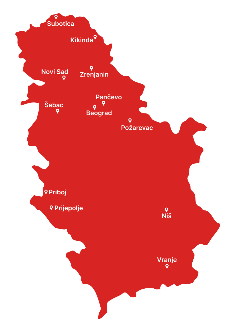Poslujemo sa 13 partnera u 12 gradova Srbije.